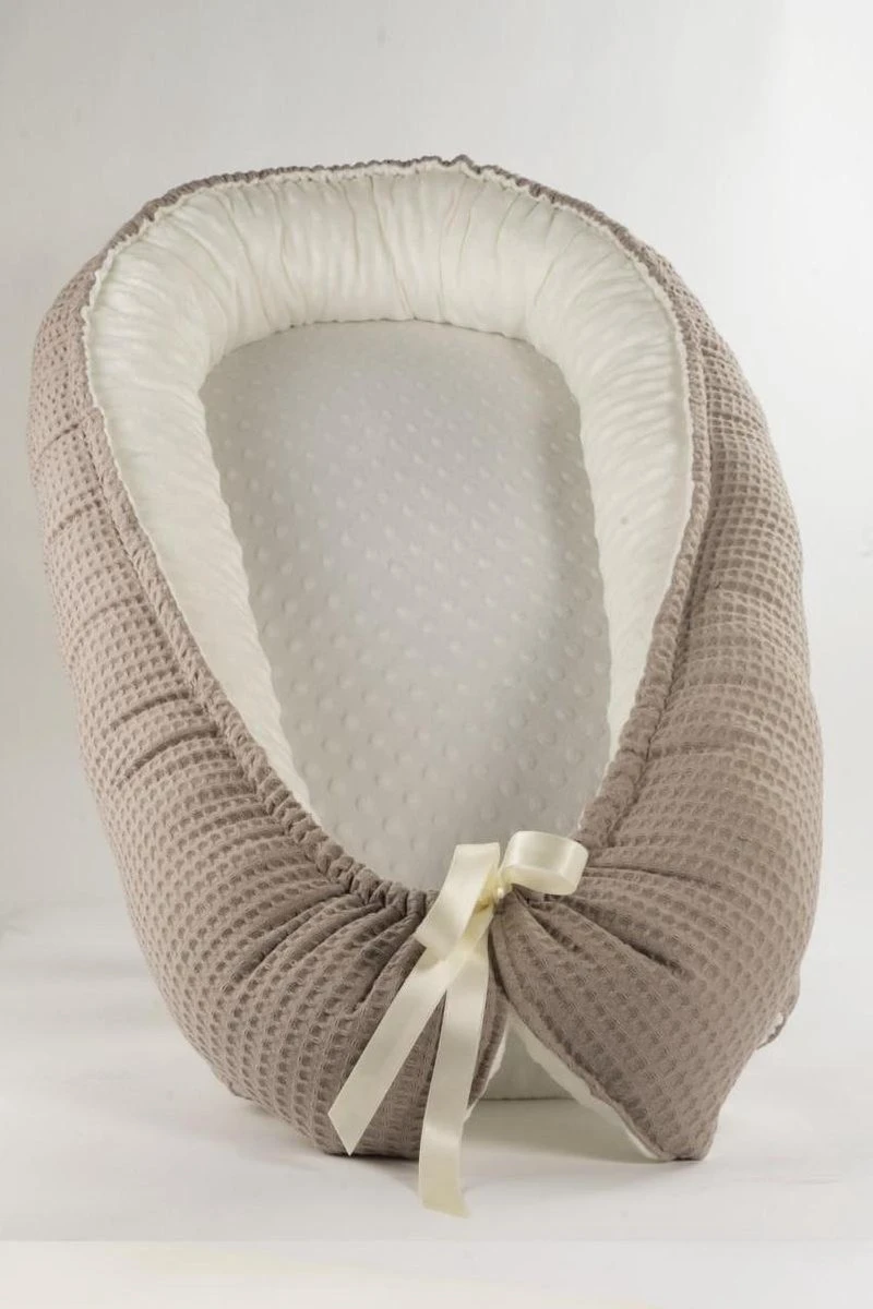 Een babynestje is een veilige manier om je kindje geborgen te laten slapen. Door de opstaande randen kan het kindje niet uit het nestje rollen en met het koordje kun je het nestje aanspannen. Dit leuke babynestje wordt met de hand gemaakt van taupekleur wafelstof gecombineerd met een zachte off white minky.. Beide van 100% katoen. Je kunt het nestje aan beide zijdes gebruiken en deze kleur is geschikt voor zowel een jongen als meisje..Het matrasje is 65 cm lang. In de goedgevulde randen zit een vulling van polyether fyberfill en de nestjes zijn wasbaar op 30 graden. Onze nestjes worden met liefde gemaakt en ook vaak met liefde als kraamcadeau gegeven. Ben je op zoek naar een andere kleur? Laat het ons gerust weten!