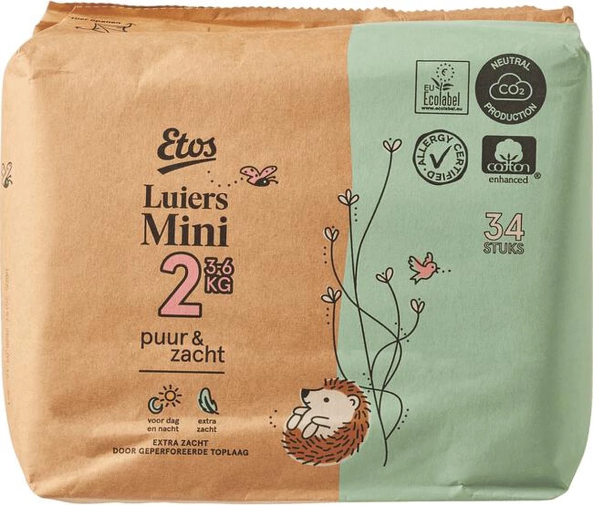 Etos Luiers Puur & Zacht Mini 2 bevatten zorgvuldig geselecteerde materialen, waaronder FSC® gecertificeerde cellulose en hoogwaardig, verantwoordelijk geteeld katoen. De luiers zijn tevens allergy certified wat betekent dat de huidvriendelijkheid voor het gevoelige babyhuidje wordt gewaarborgd. De zachte, geperforeerde toplaag zorgt ervoor dat vocht snel doordringt tot in de kern van de luier en houdt het gevoelige huidje van je baby extra lang droog, zowel overdag als ’s nachts. Etos Luiers Puur & Zacht Mini 2 hebben een urine-indicator en een naveluitsparing, speciaal voor de allerkleinsten. Respecteert de gevoelige babyhuid.