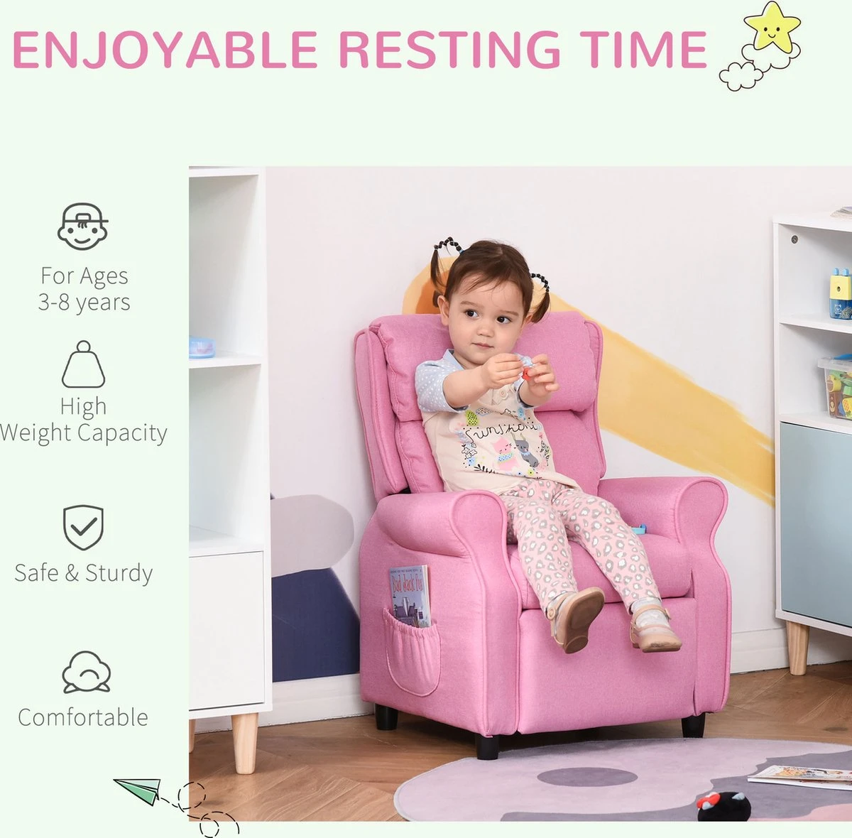 Dit ligbed voor kinderen van HOMCOM is het perfecte toevluchtsoord om te ontspannen, opladen en tot rust te komen. De maat is perfect afgestemd op kinderen. De zachte vulling en het linnen bovenwerk bieden veel zitcomfort. Met deze stoel van HOMCOM geef je je kinderen een plek om te ontspannen en zich goed te voelen. Eigenschappen: · Perfect voor een dutje, lezen of gewoon ontspannen · Het bovenmateriaal is gemaakt van linnen stof · Royale schuimvulling · Een rugleuning verstelbaar tot 120° · Met zachte armleuningen en twee zijzakken · Met houten frame en stoelpoten van PP kunststof · Gemakkelijk te onderhouden en duurzaam · De poten en de rugleuning zijn afneembaar · Montage is nodig Technische gegevens: · Kleur: blauw · Materiaal: hout, PP-kunststof · Afmetingen: 58 b x 53 d x 70 h cm · Afmetingen rugleuning: 44 b x 13 d x 39,5 h cm · Zitgrootte: 32 b x 30 d cm · Dikte van het schuimkussen: 8 cm · Maximaal draagvermogen: 65 kg · Aanbevolen voor 3-8 jaar · Certificaten: EN71-1-2-3 · Omvang van de levering: 1 x kinderslaapbank · Verzendbriefje: Geen verzending naar Nederlandse eilanden.