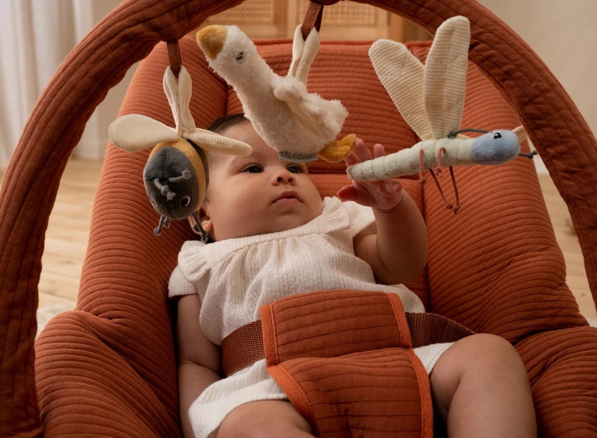 De wipstoel wordt geleverd inclusief speelboog met 3 leuke speeltjes van Little Dutch.