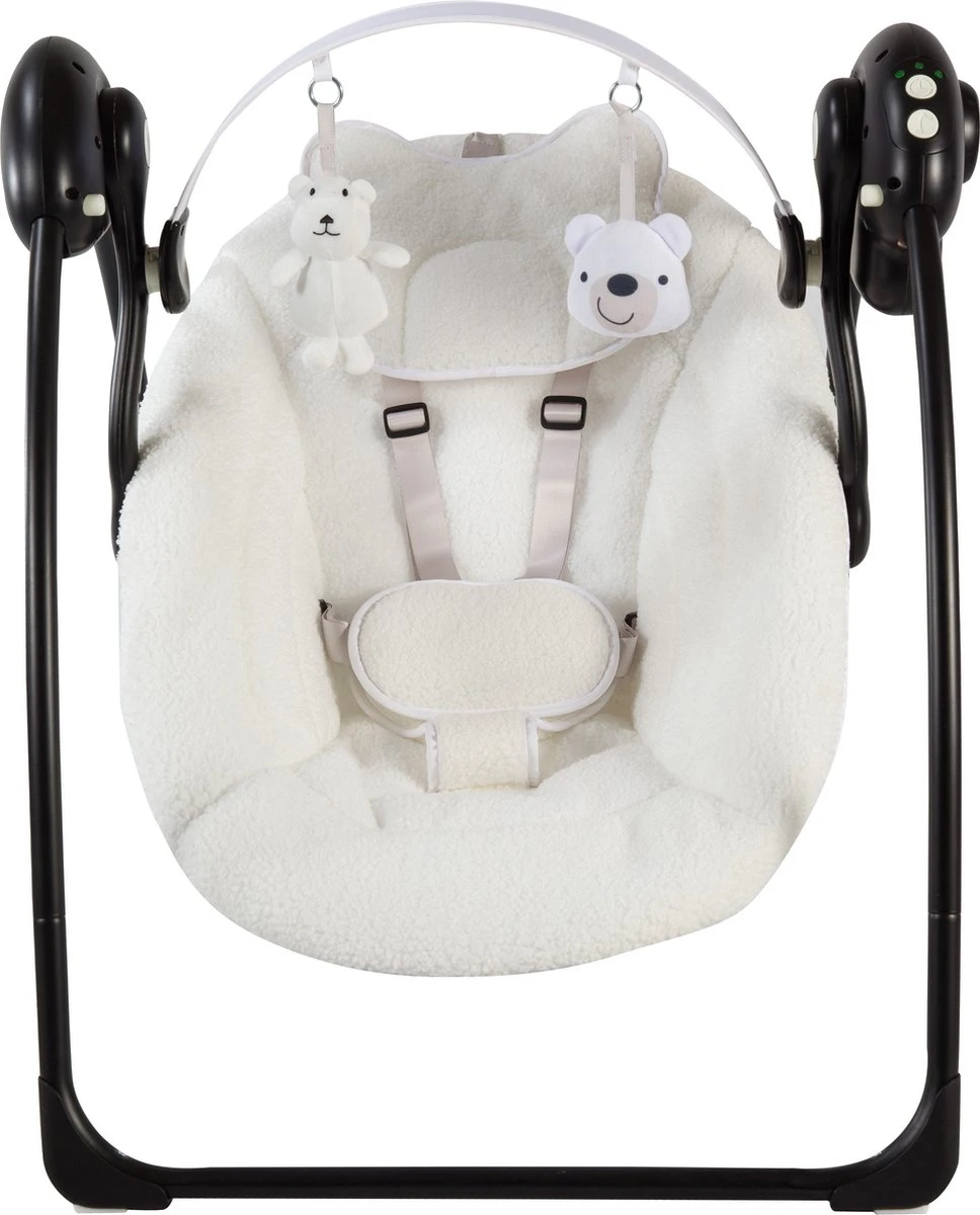 De swing is voorzien van twee leuke speeltjes, melodietjes en schommelsnelheden waar je kindje zich uren mee kan vermaken. Dankzij de 3-punts gordel zit je kindje altijd veilig in de swing en hoef ook jij je nergens zorgen over te maken, ideaal!